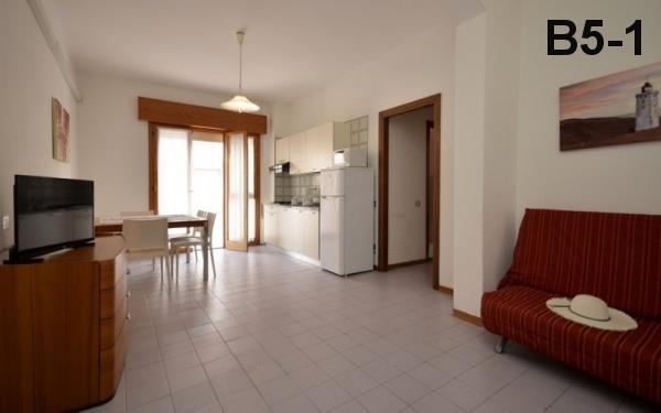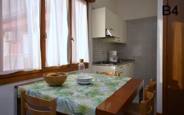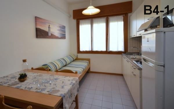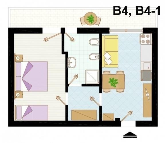 B4-1: (max. 4 osoby) ložnice s dvojlůžkem (příp. s třetím lůžkem), denní místnost s rozkládacím dvojlůžkem (příp. jednolůžkem) a kuchyňským koutem. Balkon. |