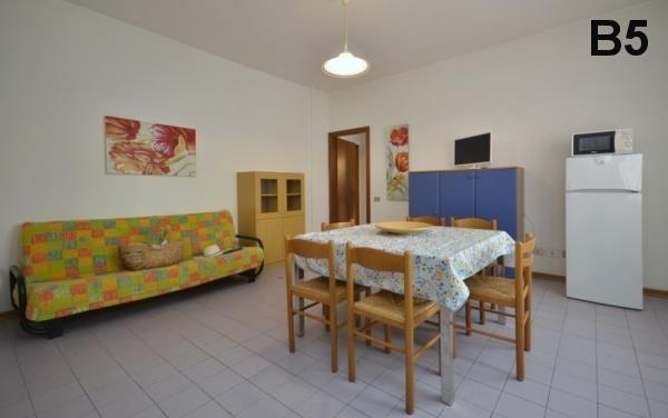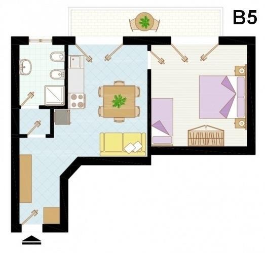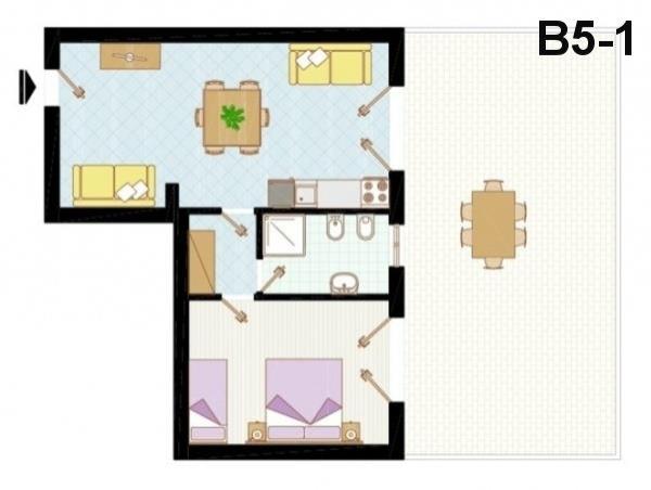 B5: (max. 5 osob) ložnice s dvojlůžkem a dalším lůžkem, denní místnost s rozkládacím dvojlůžkem a kuchyňským koutem. Balkon. |