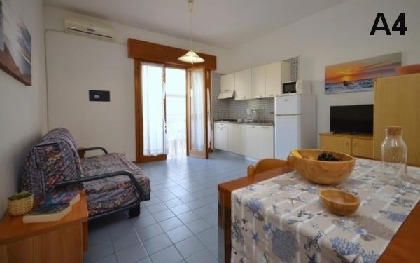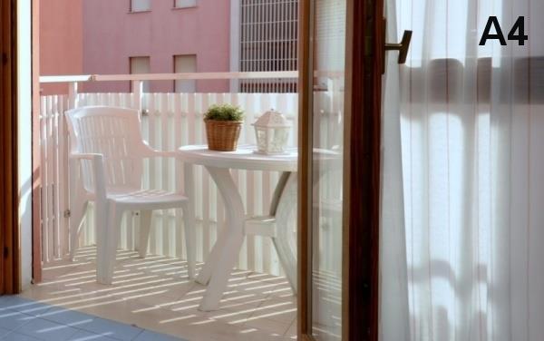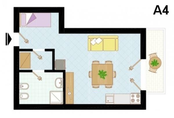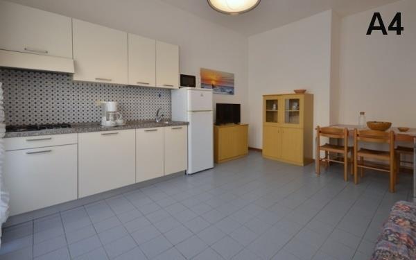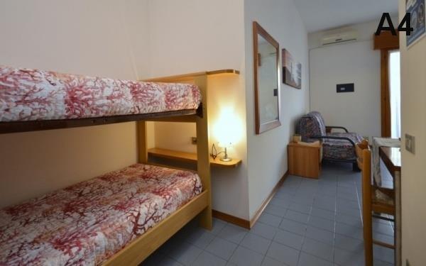 A4: (max. 4 osoby) studio (jedna místnost) s rozkládacím dvojlůžkem a patrovou postelí, kuchyňský kout. Balkon. |