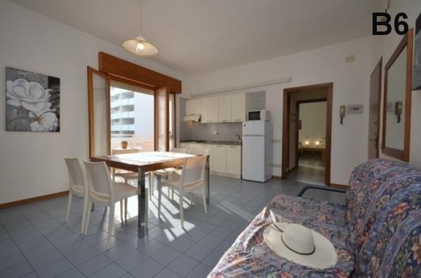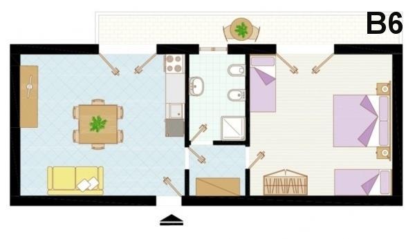 B6: (max. 6 osob) ložnice s dvojlůžkem a dalšími dvěma lůžky, denní místnost s rozkládacím dvojlůžkem a kuchyňským koutem, balkon. |