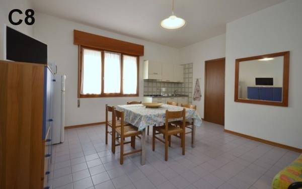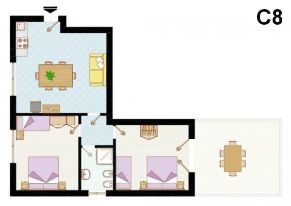 C8: (max. 8 osob) dvě ložnice vždy s dvojlůžkem a dalším lůžkem, denní místnost s rozkládacím dvojlůžkem a kuchyňským koutem, balkon. |