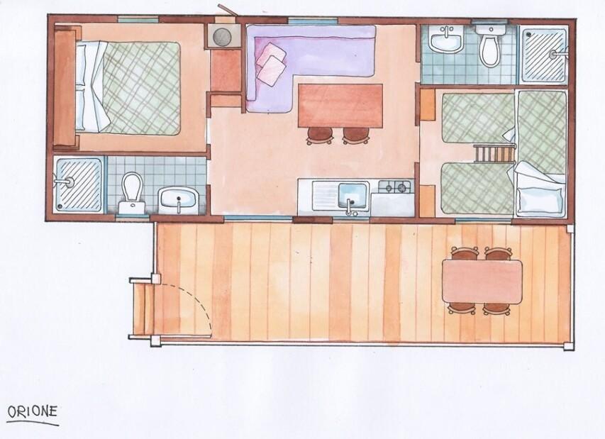 ložnice s manželskou postelí, ložnice se dvěma lůžky a menším vyvýšeným lůžkem, obývací pokoj s kuchyňským koutem. jako 5. osoba povoleno pouze dítě do 8 let. přízemí, terasa, krytá, oplocená, klimatizace v ceně, topení, TV, Wi-Fi na pokoji, lednice, sprcha, (sprchový kout), druhé soc. zařízení, kompletní, wc a umyvadlo, zahradní nábytek, parkovací místo, v ceně, nástupní dny kdykoli, min. pobyt v období do 13.06. a od 06.09. min. 3 noci, 13.06. - 06.09. min. 7 nocí, příjezd od 16:00 do 19:00, odjezd od 08:00 do 10:00 bungalow Cottage Riviera Cesenatico 4+2: ložnice s manželskou postelí, ložnice se dvěma lůžky, obývací pokoj s rozkládacím dvougaučem a kuchyňským koutem. 5. a 6. osoba od 8 let za poplatek. přízemí, terasa, krytá, klimatizace v ceně, topení, TV, Wi-Fi na pokoji, lednice, samostatný mrazák, mikrovlnná trouba, sprcha, (sprchový kout), zahradní nábytek, parkovací místo, v ceně, nástupní dny kdykoli, min. pobyt v období do 13.06. a od 06.09. min. 3 noci, 13.06. - 06.09. min. 7 nocí, příjezd od 16:00 do 19:00, odjezd od 08:00 do 10:00 |