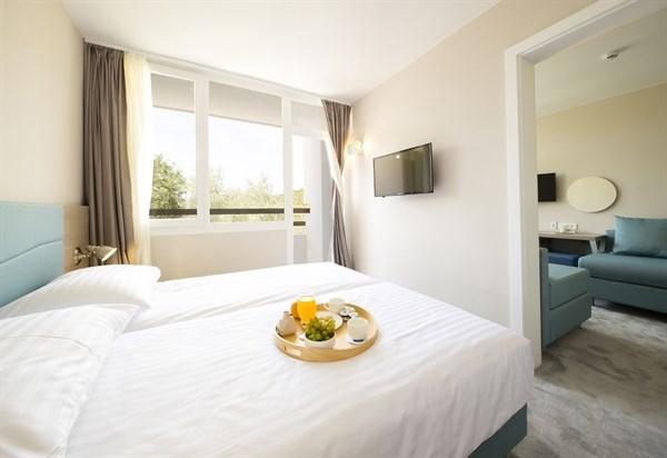 Klimatizované pokoje s vlastním příslušenstvím, SAT/TV, minibarem, Wi-Fi, trezorem, fénem a balkonem. K dispozici jsou typy pokojů: Comfort - dvoulůžkový pokoj, bez možnosti přistýlky, s balkonem; Superior - dvoulůžkový pokoj s možností přistýlky, s balkonem; Superior junior suite - dvoulůžkový pokoj - ložnice a obývací pokoje s rozkládacím gaučem, s balkonem; Rodinný pokoj Superior - dva spojené pokoje, každý s vlastní koupelnou, s balkonem. Pokoje jsou orientované do parkové strany. Dětská postýlka na dotaz zdarma. |